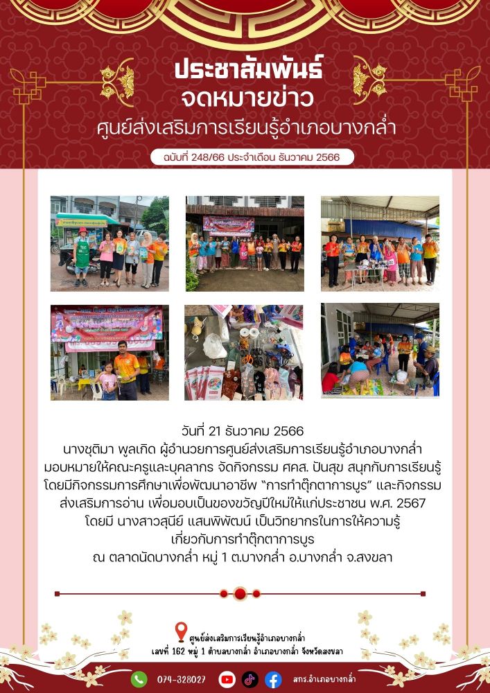 ข่าวประชาสัมพันธ์ นที่ 21 ธันวาคม 2566 นางชุติมา พูลเกิด ผู้อำนวยการศูนย์ส่งเสริมการเรียนรู้อำเภอบางกล่ำ มอบหมายให้คณะครูและบุคลากร จัดกิจกรรม ศคส. ปันสุข สนุกกับการเรียนรู้ โดยมีกิจกรรมการศึกษาเพื่อพัฒนาอาชีพ การทำตุ๊กตาการบูร และกิจกรรมส่งเสริมการอ่าน เพื่อมอบเป็นของขว