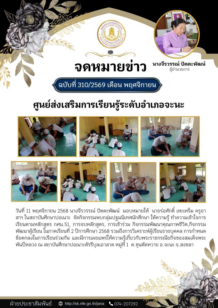 วันที่ 11 พฤศจิกายน 2568 นางจีรวรรณ์ ปัตตะพัฒน์ ผู้อำนวยการศูนย์ส่งเสริมการเรียนรู้ระดับอำเภอจะนะ มอบหมายให้นายร่อศักดิ์ เหะเหร็ม ครูอาสาฯ ในสถาบันศึกษาปอเนาะ จัดกิจกรรมพบกลุ่มปฐมนิเทศนักศึกษา ให้ความรู้ ทำความเข้าใจการเรียนตามหลักสูตร กศน.51, การจบหลักสูตร, การเข้าร่วม กิจกรรมพัฒนาคุณภาพชีวิต,กิจกรรม พัฒนาผู้เรียน ในภาคเรียนที่ 2 ปีการศึกษา 2568 รวมถึงการวิเคราะห์ผู้เรียนรายบุคคล การกำหนดข้อตกลงในการเรียนร่วมกัน และมีการเผยแพร่ให้ความรู้เกี่ยวกับพระราชกรณียกิจของสมเด็จพระพันปีหลวง ณ สถาบันศึกษาปอเนาะตัรรีบุลเอาลาด หมู่ที่ 1 ต.ขุนตัดหวาย อ.จะนะ จ.สงขลา