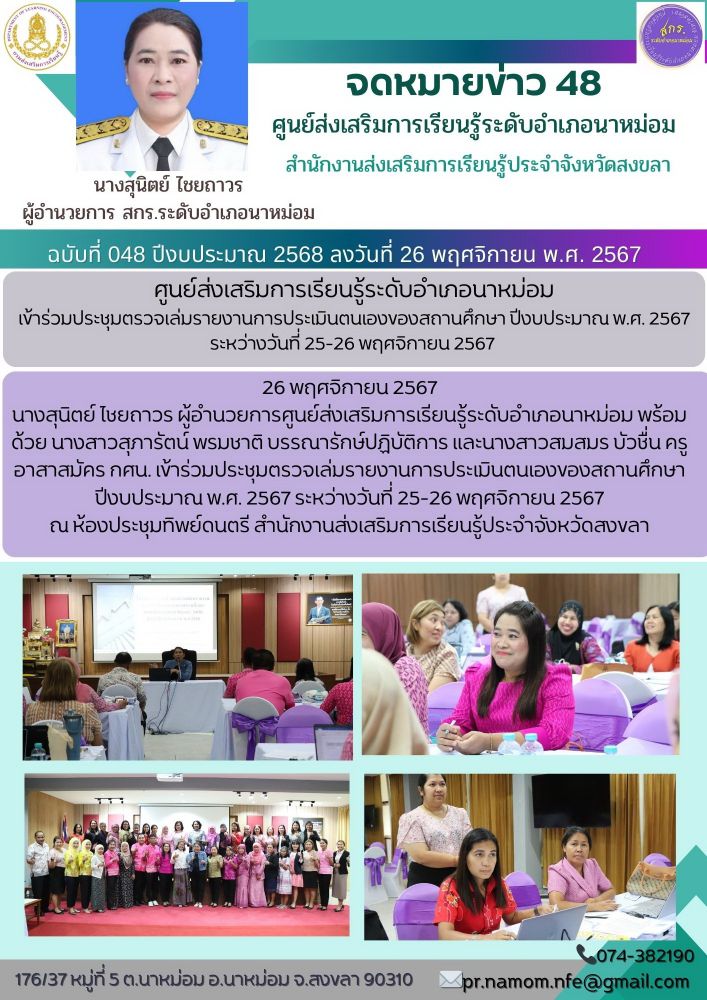 นางสุนิตย์ ไชยถาวร ผู้อำนวยการศูนย์ส่งเสริมการเรียนรู้ระดับอำเภอนาหม่อม พร้อมด้วย นางสาวสุภารัตน์ พรมชาติ บรรณารักษ์ปฏิบัติการ และนางสาวสมสมร บัวชื่น ครู อาสาสมัคร กศน. เข้าร่วมประชุมตรวจเล่มรายงานการประเมินตนเองของสถานศึกษา ปีงบประมาณ พ.ศ. 2567 ระหว่างวันที่ 25-26 พฤศจิกายน 2567