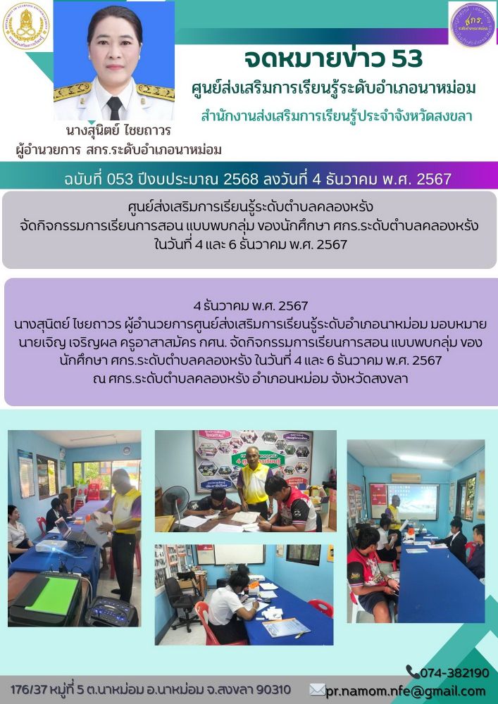 นางสุนิตย์ ไชยถาวร ผู้อำนวยการศูนย์ส่งเสริมการเรียนรู้ระดับอำเภอนาหม่อม มอบหมาย นายเจิญ เจริญผล ครูอาสาสมัคร กศน. จัดกิจกรรมการเรียนการสอน แบบพบกลุ่ม ของนักศึกษา ศกร.ระดับตำบลคลองหรัง ในวันที่ 4 และ 6 ธันวาคม พ.ศ. 2567