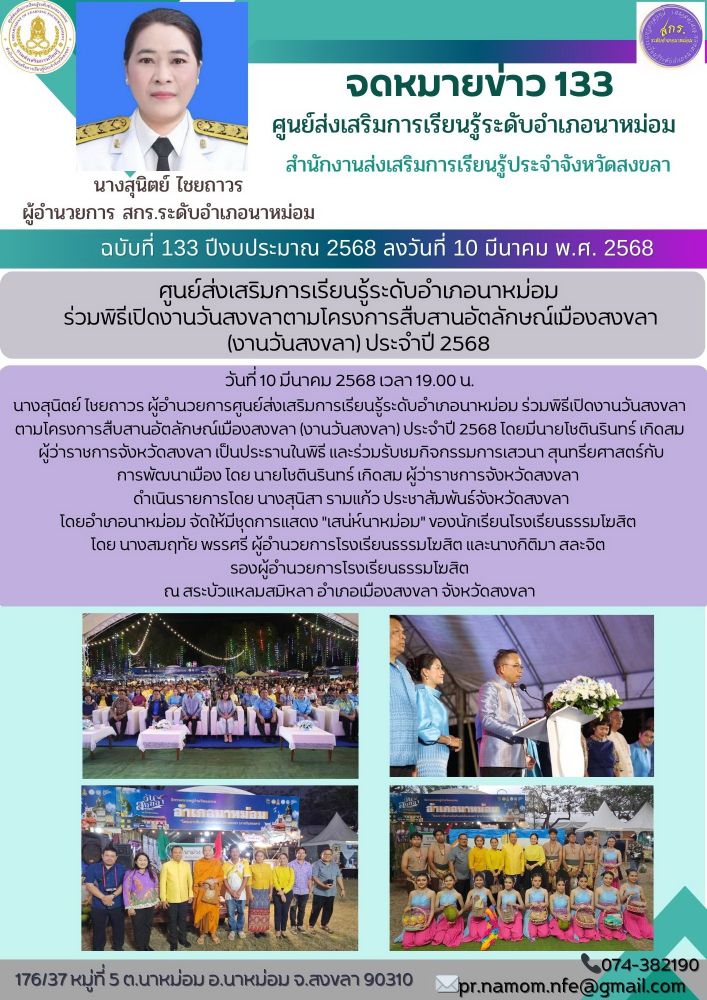 นางสุนิตย์ ไชยถาวร ผู้อำนวยการศูนย์ส่งเสริมการเรียนรู้ระดับอำเภอนาหม่อม ร่วมพิธีเปิดงานวันสงขลาตามโครงการสืบสานอัตลักษณ์เมืองสงขลา (งานวันสงขลา) ประจำปี 2568 โดยมีนายโชตินรินทร์ เกิดสม ผู้ว่าราชการจังหวัดสงขลา เป็นประธานในพิธี และร่วมรับชมกิจกรรมการเสวนา สุนทรียศาสตร์กับการพัฒนาเมือง โดย นายโชตินรินทร์ เกิดสม ผู้ว่าราชการจังหวัดสงขลา ดำเนินรายการโดย นางสุนิสา รามแก้ว ประชาสัมพันธ์จังหวัดสงขลา