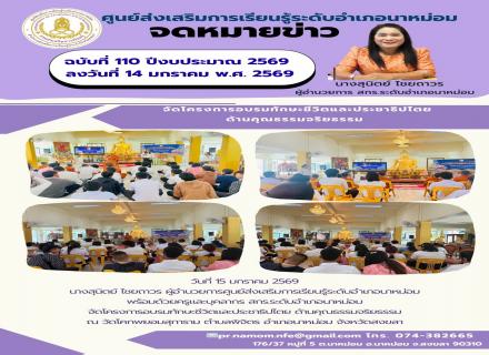 วันที่ 15 มกราคม 2569 นางสุนิตย์ ไชยถาวร ผู้อำนวยการศูนย์ส่งเสริมการเรียนรู้ระดับอำเภอนาหม่อม พร้อมด้วยครูและบุคลากร สกร.ระดับอำเภอนาหม่อม จัดโครงการอบรมทักษะชีวิตและประชาธิปไตย ด้านคุณธรรมจริยธรรม ณ วัดโคกพยอมสุการาม ตำบลพิจิตร อำเภอนาหม่อม จังห  เข้าชม :  [47]