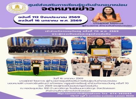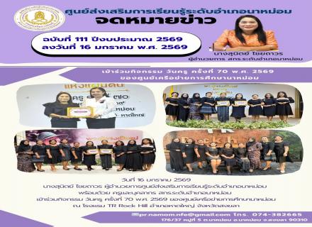 วันที่ 16 มกราคม 2569 นางสุนิตย์ ไชยถาวร ผู้อำนวยการศูนย์ส่งเสริมการเรียนรู้ระดับอำเภอนาหม่อม พร้อมด้วย ครูและบุคลากร สกร.ระดับอำเภอนาหม่อม เข้าร่วมกิจกรรม วันครู ครั้งที่ 70 พ.ศ. 2569 ของศูนย์เครือข่ายการศึกษานาหม่อม ณ โรงแรม TR Rock Hill อำเภ  เข้าชม :  [48]
