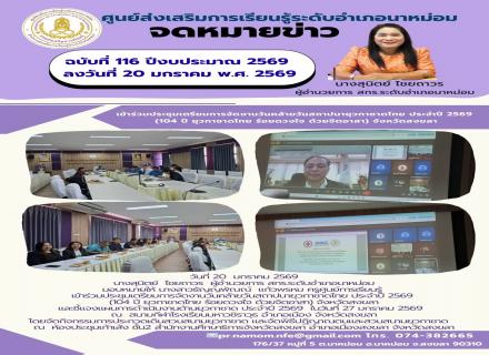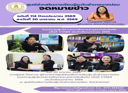 วันที่ 20 มกราคม 2569 นางสุนิตย์ ไชยถาวร ผู้อำนวยการศูนย์ส่งเสริมการเรียนรู้ระดับอำเภอนาหม่อม ร่วมประชุมผู้บริหารสถานศึกษาและบุคลากรในสังกัด ครั้งที่ 1/2569 ประจำเดือนมกราคม 2569 ณ ศูนย์ส่งเสริมการเรียนรู้ระดับอำเภอควนเนียง จังหวัดสงขลา น  เข้าชม :  [135]