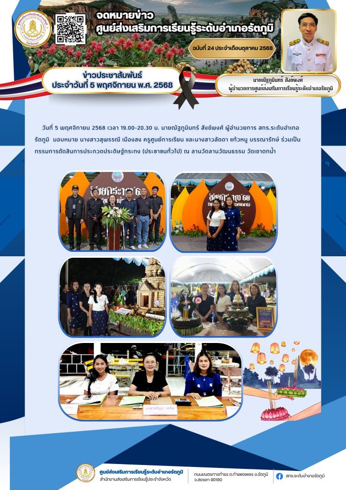 นายณัฐภูมินทร์ สังข์พงศ์ ผู้อำนวยการ สกร.ระดับอำเภอรัตภูมิ มอบหมาย นางสาวสุพรรณี เมืองสง ครูศูนย์การเรียน และนางสาวลัดดา แก้วหนู บรรณารักษ์ ร่วมเป็นกรรมการตัดสินการประกวดประดิษฐ์กระทง (ประชาชนทั่วไป) ณ ลานวัดลานวัฒนธรรม วัดเขาตกน้ำ