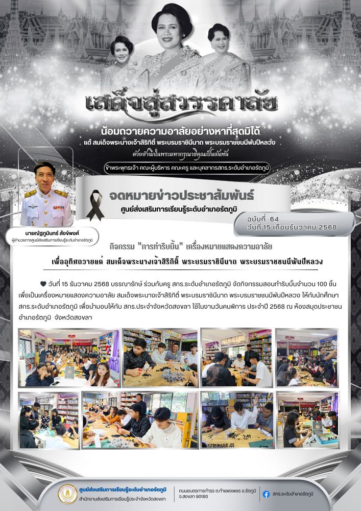 กิจกรรมสอนทำริบบิ้น จำนวน 100 ชิ้น เพื่อเป็นเครื่องหมายแสดงความอาลัย สมเด็จพระนางเจ้าสิริกิติ์ พระบรมราชินีนาถ พระบรมราชชนนีพันปีหลวง 21 / ธ.ค. / 2568