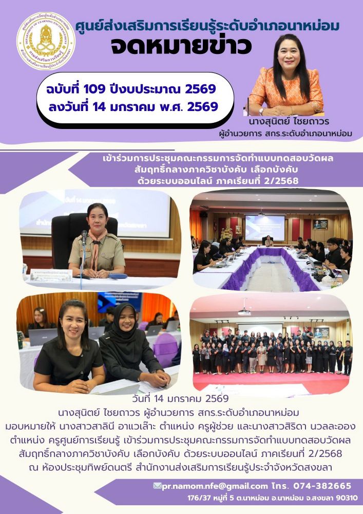 นางสุนิตย์ ไชยถาวร ผู้อำนวยการ สกร.ระดับอำเภอนาหม่อม มอบหมายให้ นางสาวสาลินี อาแวเล๊าะ ตำแหน่ง ครูผู้ช่วย และนางสาวสิริดา นวลละออง ตำแหน่ง ครูศูนย์การเรียนรู้ เข้าร่วมการประชุมคณะกรรมการจัดทำแบบทดสอบวัดผลสัมฤทธิ์กลางภาควิชาบังคับ เลือกบังคับ ด้วยระบบออนไลน์ ภาคเรียนที่ 2/2568