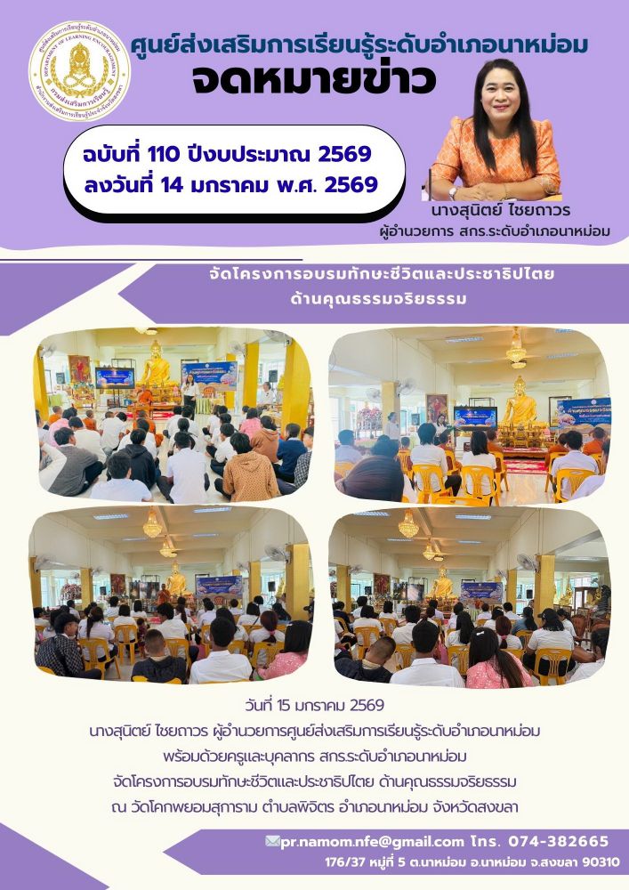 นางสุนิตย์ ไชยถาวร ผู้อำนวยการศูนย์ส่งเสริมการเรียนรู้ระดับอำเภอนาหม่อม พร้อมด้วยครูและบุคลากร สกร.ระดับอำเภอนาหม่อม จัดโครงการอบรมทักษะชีวิตและประชาธิปไตย ด้านคุณธรรมจริยธรรม