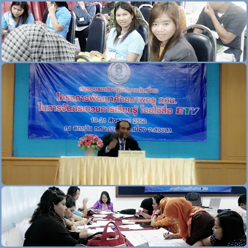 วันที่ ๑๙ สิงหาคม ๒๕๕๘ นางสาวสุภิศรา บุญช่วย นางสาวนูรีย๊ะ ยีหรันและนางสาวอรอนงค์ พุทธปาน ครู กศน.ตำบล เข้าร่วมร่วมการอบรมเชิงปฏิบัติการต่อเนื่องโครงการพัฒนาศักยภาพครู กศน.ในการจัดกระบวนการเรียนรู้ โดยใช้สื่อ ETV ระหว่างวันที่ ๑๙ - ๒๑ สิงหาคม ๒๕๕๘ ณ สถาบันกศน.ภาคใต้ อ.เมือง จ.สงขลา
