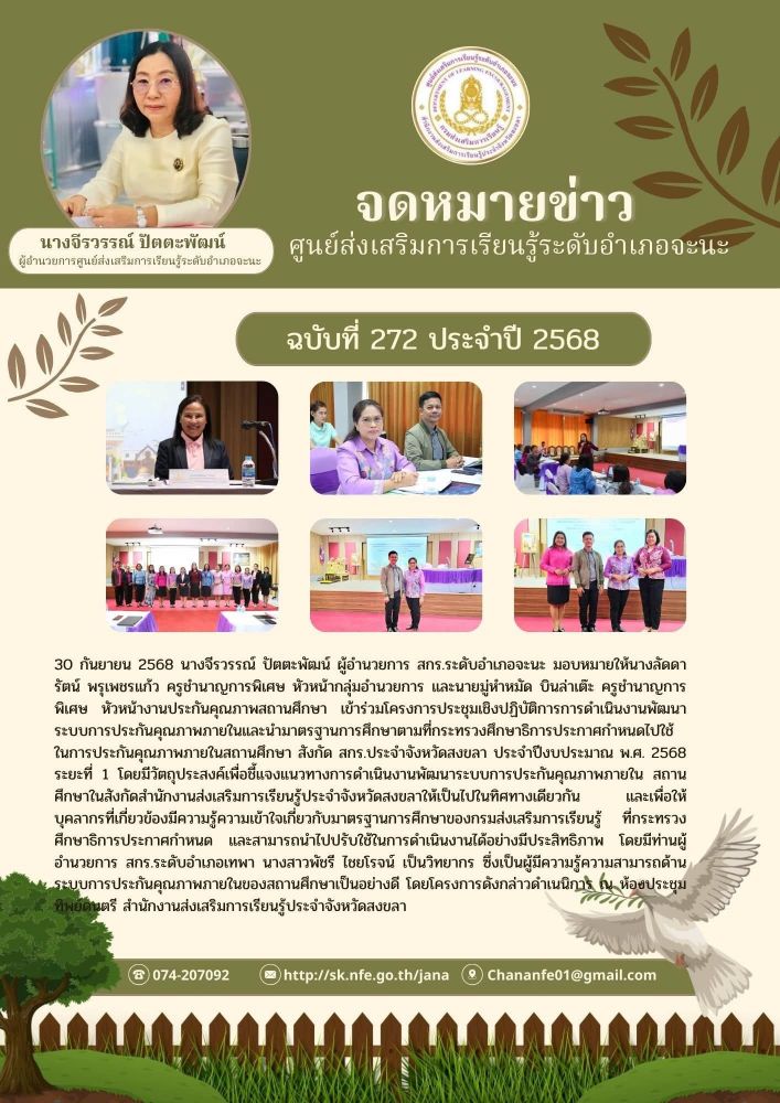 นางจีรวรรณ์ ปัตตะพัฒน์ ผู้อำนวยการ สกร.ระดับอำเภอจะนะ มอบหมายให้นางลัดดารัตน์ พรุเพชรแก้ว ครูชำนาญการพิเศษ หัวหน้ากลุ่มอำนวยการ และนายมู่หำหมัด บินล่าเต๊ะ ครูชำนาญการพิเศษ หัวหน้างานประกันคุณภาพสถานศึกษา เข้าร่วมโครงการประชุมเชิงปฏิบัติการการดำเนินงานพัฒนาระบบการประกันคุณภาพภายในและนำมาตรฐานการศึกษาตามที่กระทรวงศึกษาธิการประกาศกำหนดไปใช้ในการประกันคุณภาพภายในสถานศึกษา สังกัด สกร.ประจำจังหวัดสงขลา ประจำปีงบประมาณ พ.ศ. 2568 ระยะที่ 1