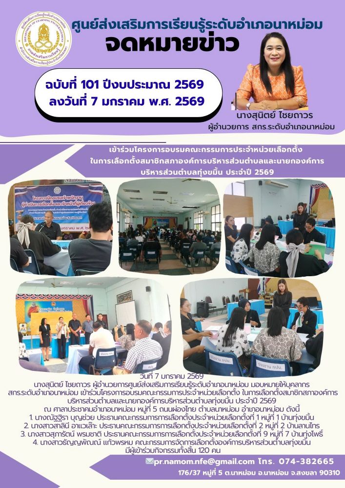 นางสุนิตย์ ไชยถาวร ผู้อำนวยการศูนย์ส่งเสริมการเรียนรู้ระดับอำเภอนาหม่อม มอบหมายให้บุคลากร สกร.ระดับอำเภอนาหม่อม เข้าร่วมโครงการอบรมคณะกรรมการประจำหน่วยเลือกตั้ง ในการเลือกตั้งสมาชิกสภาองค์การบริหารส่วนตำบลและนายกองค์การบริหารส่วนตำบลทุ่งขมิ้น ประจำปี 2569