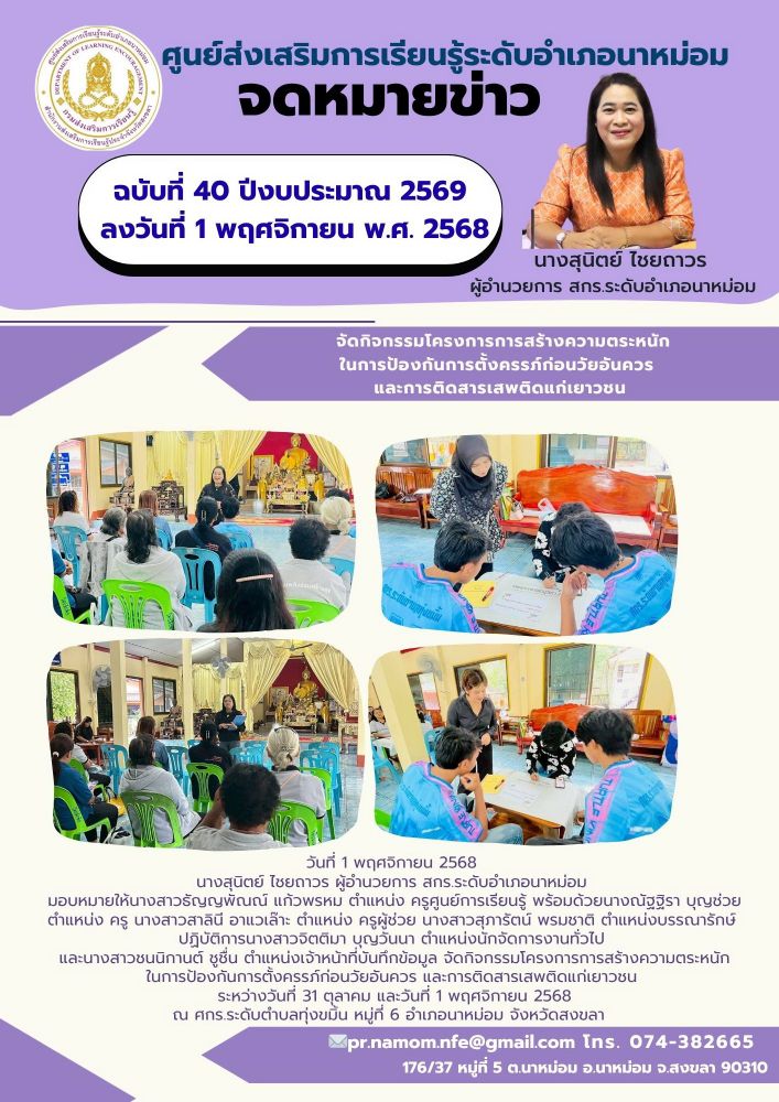 นางสุนิตย์ ไชยถาวร ผู้อำนวยการ สกร.ระดับอำเภอนาหม่อม มอบหมายให้นางสาวธัญญพัณณ์ แก้วพรหม ตำแหน่ง ครูศูนย์การเรียนรู้ พร้อมด้วยนางณัฐฐิรา บุญช่วย ตำแหน่ง ครู นางสาวสาลินี อาแวเล๊าะ ตำแหน่ง ครูผู้ช่วย นางสาวสุภารัตน์ พรมชาติ ตำแหน่งบรรณารักษ์ปฏิบัติการนางสาวจิตติมา บุญวันนา ตำแหน่งนักจัดการงานทั่วไป และนางสาวชนนิกานต์ ชูชื่น ตำแหน่งเจ้าหน้าที่บันทึกข้อมูล จัดกิจกรรมโครงการการสร้างความตระหนักในการป้องกันการตั้งครรภ์ก่อนวัยอันควร และการติดสารเสพติดแก่เยาวชน ระหว่างวันที่ 31 ตุลาคม และวันที่ 1 พฤศจิกายน 2568
