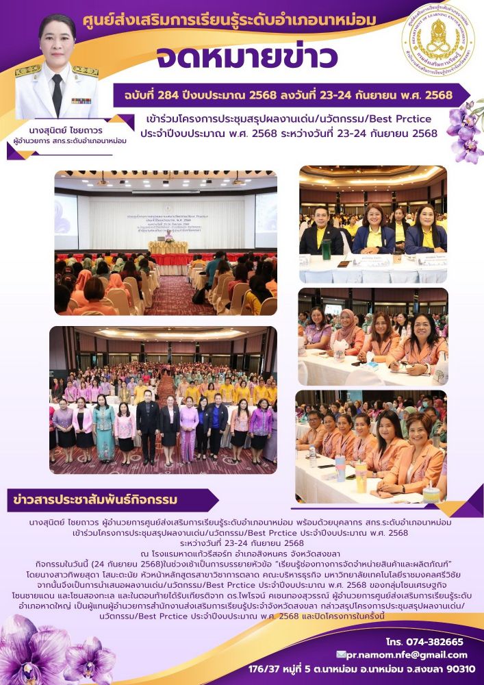 กิจกรรมในวันนี้ (24 กันยายน 2568)ในช่วงเช้าเป็นการบรรยายหัวข้อ “เรียนรู้ช่องทางการจัดจำหน่ายสินค้าและผลิตภัณฑ์” โดยนางสาวทิพยสุดา โสมะตะนัย หัวหน้าหลักสูตรสาขาวิชาการตลาด คณะบริหารธุรกิจ มหาวิทยาลัยเทคโนโลยีราชมงคลศรีวิชัย จากนั้นจึงเป็นการนำเสนอผลงานเด่น/นวัตกรรม/Best Prctice ประจำปีงบประมาณ พ.ศ. 2568 ของกลุ่มโซนเศรษฐกิจ โซนชายแดน และโซนสองทะเล และในตอนท้ายได้รับเกียรติจาก ดร.ไพโรจน์ คเชนทองสุวรรณ์ ผู้อำนวยการศูนย์ส่งเสริมการเรียนรู้ระดับอำเภอหาดใหญ่ เป็นผู้แทนผู้อำนวยการสำนักงานส่งเสริมการเรียนรู้ประจำจังหวัดสงขลา กล่าวสรุปโครงการประชุมสรุปผลงานเด่น/นวัตกรรม/Best Prctice ประจำปีงบประมาณ พ.ศ. 2568 และปิดโครงการในครั้งนี้