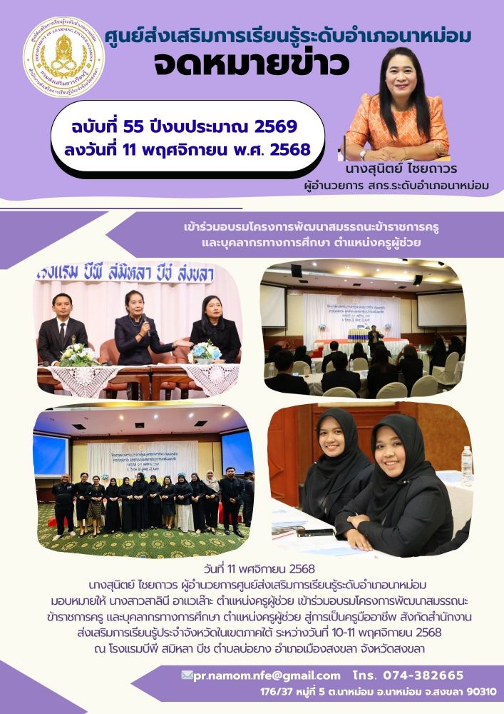 นางสุนิตย์ ไชยถาวร ผู้อำนวยการศูนย์ส่งเสริมการเรียนรู้ระดับอำเภอนาหม่อม มอบหมายให้ นางสาวสาลินี อาแวเล๊าะ ตำแหน่งครูผู้ช่วย เข้าร่วมอบรมโครงการพัฒนาสมรรถนะข้าราชการครู และบุคลากรทางการศึกษา ตำแหน่งครูผู้ช่วย สู่การเป็นครูมืออาชีพ สังกัดสำนักงานส่งเสริมการเรียนรู้ประจำจังหวัดในเขตภาคใต้ ระหว่างวันที่ 10-11 พฤศจิกายน 2568