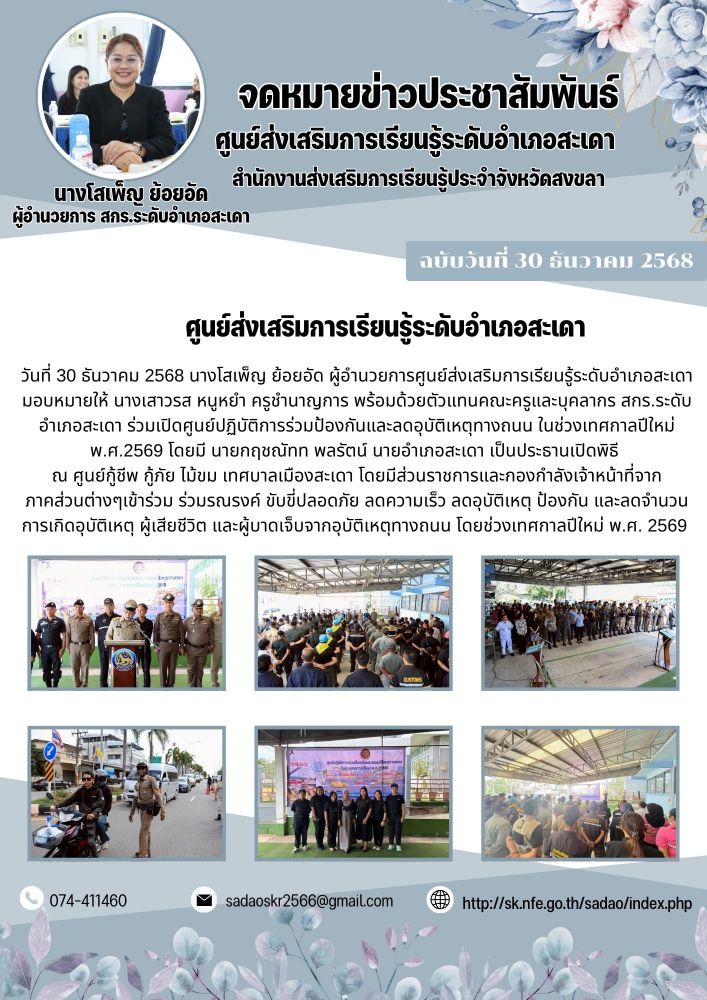 ศูนย์ส่งเสริมการเรียนรู้ระดับอำเภอสะเดา ร่วมเปิดศูนย์ปฏิบัติการร่วมป้องกันและลดอุบัติเหตุทางถนน ในช่วงเทศกาลปีใหม่ พ.ศ.2569 30 / ธ.ค. / 2568