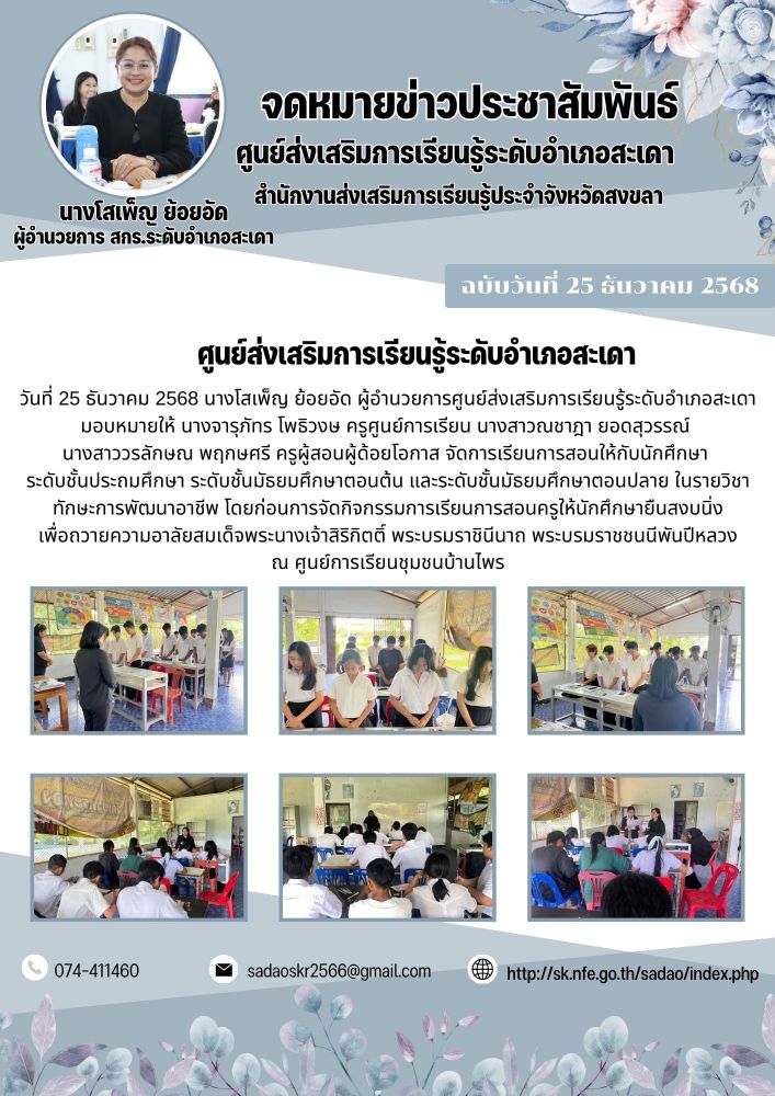 ศูนย์ส่งเสริมการเรียนรู้ระดับอำเภอสะเดา จัดการเรียนการสอนให้กับนักศึกษา 30 / ธ.ค. / 2568