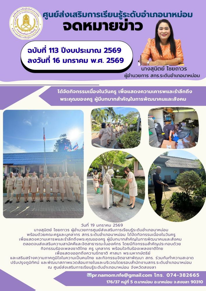 นางสุนิตย์ ไชยถาวร ผู้อำนวยการศูนย์ส่งเสริมการเรียนรู้ระดับอำเภอนาหม่อม พร้อมด้วยคณะครูและบุคลากร สกร.ระดับอำเภอนาหม่อม ได้จัดกิจกรรมเนื่องในวันครู เพื่อแสดงความเคารพและรำลึกถึงพระคุณของครู ผู้มีบทบาทสำคัญในการพัฒนาคนและสังคม ตลอดจนส่งเสริมความสามัคคีและจิตสาธารณะในองค์กร โดยมีกิจกรรมสำคัญประกอบด้วย