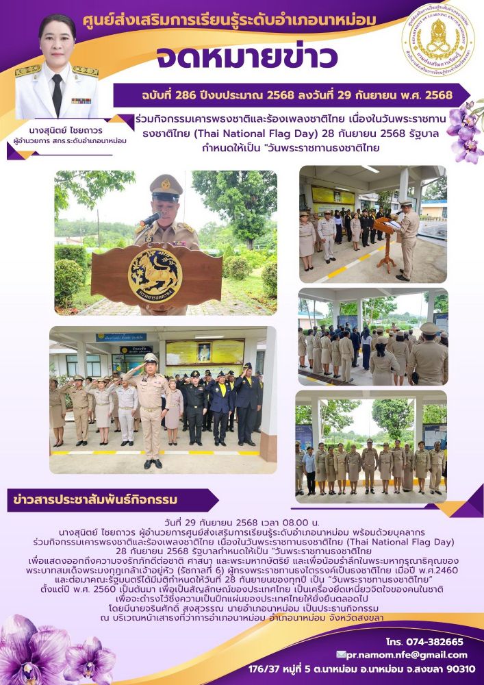 นางสุนิตย์ ไชยถาวร ผู้อำนวยการศูนย์ส่งเสริมการเรียนรู้ระดับอำเภอนาหม่อม พร้อมด้วยบุคลากร ร่วมกิจกรรมเคารพธงชาติและร้องเพลงชาติไทย เนื่องในวันพระราชทานธงชาติไทย (Thai National Flag Day) 28 กันยายน 2568 รัฐบาลกำหนดให้เป็น "วันพระราชทานธงชาติไทย