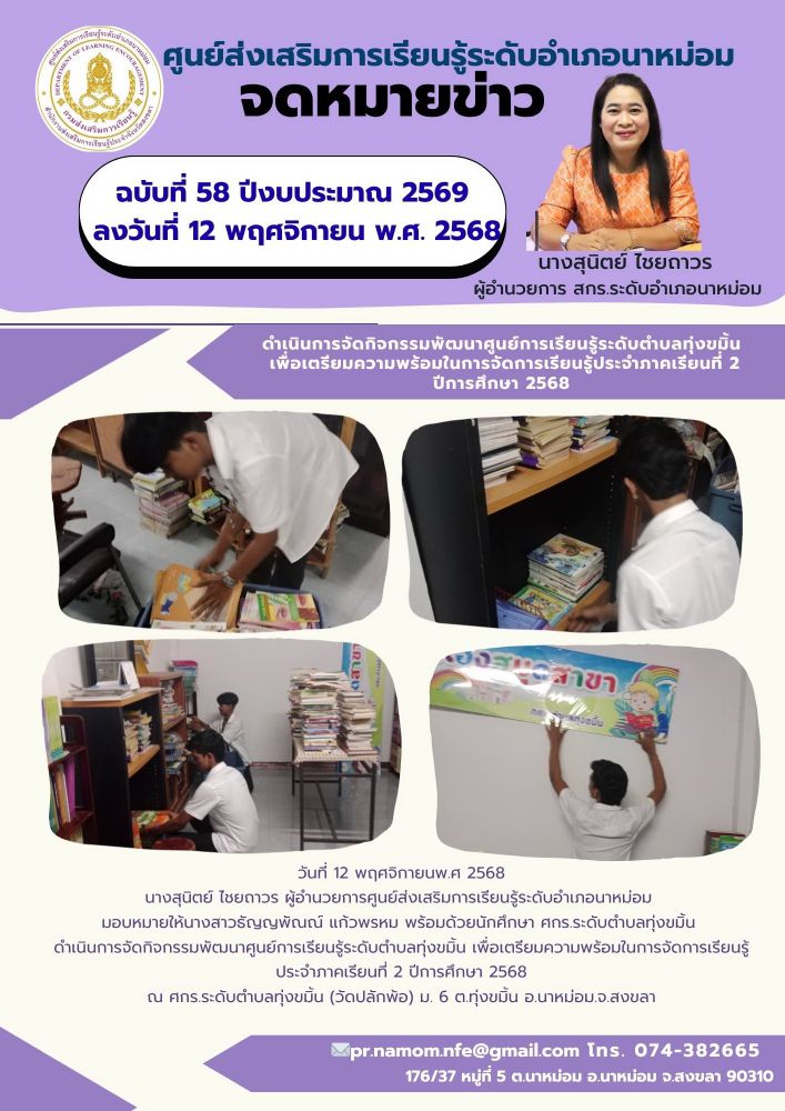 นางสุนิตย์ ไชยถาวร ผู้อำนวยการศูนย์ส่งเสริมการเรียนรู้ระดับอำเภอนาหม่อม มอบหมายให้นางสาวธัญญพัณณ์ แก้วพรหม พร้อมด้วยนักศึกษา ศกร.ระดับตำบลทุ่งขมิ้น ดำเนินการจัดกิจกรรมพัฒนาศูนย์การเรียนรู้ระดับตำบลทุ่งขมิ้น เพื่อเตรียมความพร้อมในการจัดการเรียนรู้ประจำภาคเรียนที่ 2 ปีการศึกษา 2568